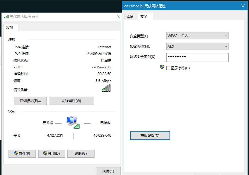 如圖,點擊【無限屬性】,然后進入無線網絡屬性界面,,點擊【安全】——【高級設置】,