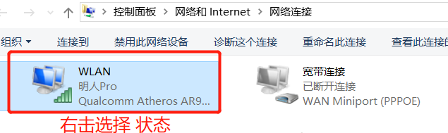 進(jìn)入網(wǎng)絡(luò)連接界面,右擊【W(wǎng)LAN】,選擇【狀態(tài)】,