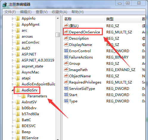 打開注冊表編輯器,在左側依次展開【HKEY_LOCAL_MACHINE/SYSTEM/CurrentControlSet/Services/Audiosrv】,然后在右側窗口找到DependOnService字符串值并雙擊,