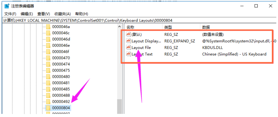 打開注冊表編輯器,點擊路徑【HKEY_LOCAL_MACHINE/ SYSTEM/ControlSet001/Control/Keyboard Layouts】,仔細檢查,會發現以0804結尾的都是簡體中文輸入法,