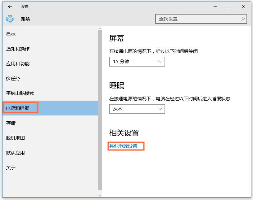 點擊【系統】,進入如圖界面,然后點擊【電源和睡眠】——【其他電源設置】,