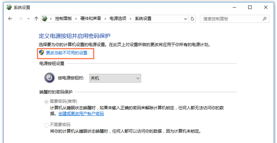進入電源系統設置界面,如圖,點擊【更改當前不可用的設置】,