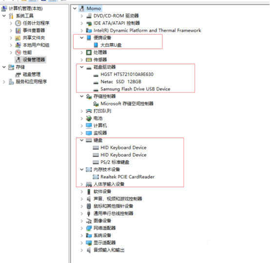 依次點擊右側的各種驅動器、控制器、設備,查找是否有之前記住的那個名字,著重查找便攜設備、磁盤驅動器、存儲控制器、鍵盤等,有可能你的U盤被識別成了其他設備;