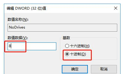 3、雙擊打開NoDrives,選擇【十進制】,輸入數(shù)值為8,點擊確定,