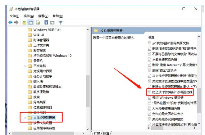 2、進入本地組策略編輯器,依次找到文件資源管理器,點擊【防止從“我的電腦”訪問驅(qū)動器】這一選項,