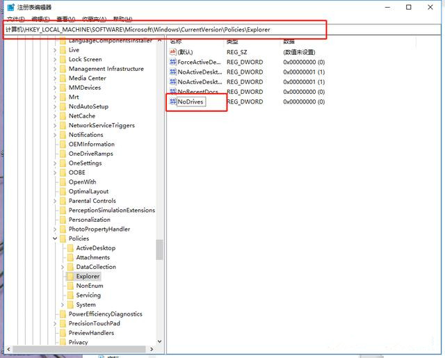 2、打開注冊表編輯器,按照路徑【HKEY_LOCAL_MACHINE/SOFTWARE/Microsoft/Windows/CurrentVersion/Policies/Explorer】依次展開,鼠標右擊窗口右側(cè),點擊【新建】——【DWORD(32-位)值(D)】,并將其命名為【NoDrives】,
