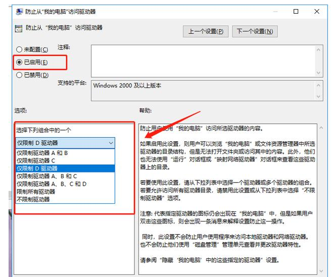 3、雙擊打開【防止從我的電腦訪問驅(qū)動器】,勾選【已啟用】,選擇需要限制訪問的驅(qū)動器,比如D盤。