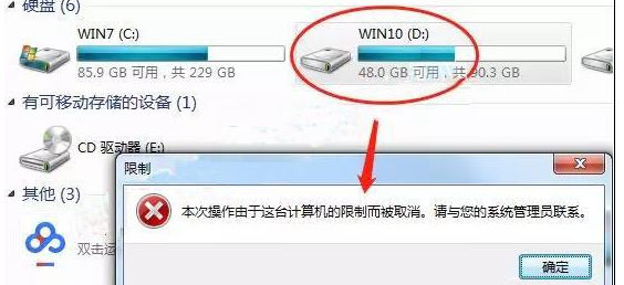 完成上述步驟,想要打開D盤,系統(tǒng)會提示【本次操作由于這臺計算機的限制而被取消。請與您的系統(tǒng)管理員聯(lián)系】。