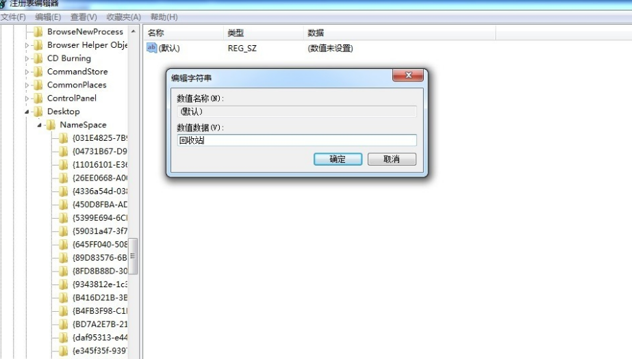 重命名之后,點擊該文件,鼠標右擊【默認】選項,選擇修改,彈出窗口,如圖,輸入回收站,點擊確定,