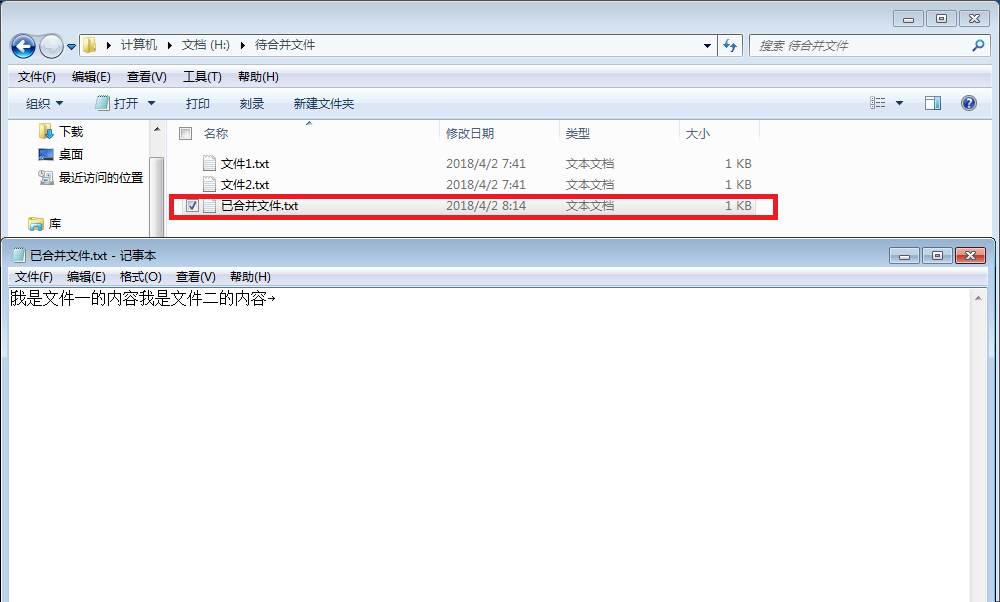 如圖,我們先打開需要處理的文件夾,在“H:/待合并文件”下有兩個文本文件,