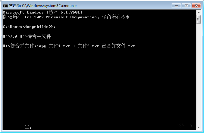 輸入【H:】,回車,進入此盤的根目錄;再輸入【cd H:/待合并文件】,回車,進入此文件夾,