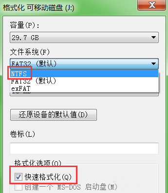 然后設置配置選項,選擇NTFS格式,該格式支持大文件,勾選【快速格式化】選項,