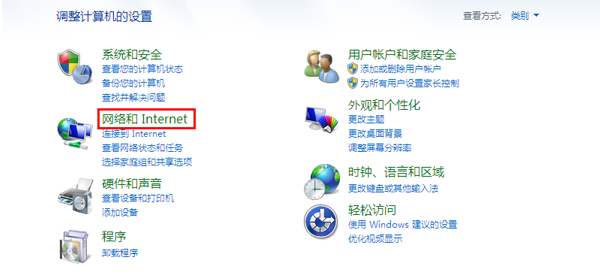 點擊桌面左下角的開始菜單,選擇“控制面板”,進入界面,點擊“網(wǎng)絡和Internet”選項,