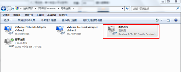 進入如下界面,找到“本地連接”,它顯示為“已禁用”狀態(tài),鼠標右鍵本地連接、選擇“啟用”,即可讓網(wǎng)絡恢復正常。