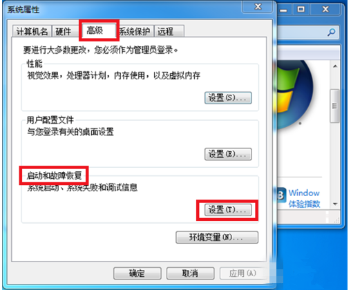 在系統屬性中點擊【高級】,在【啟動和故障恢復】選項中點擊【設置】。