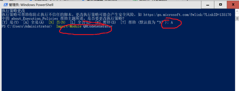 輸入“Set-ExecutionPolicy Unrestrict”回車,然后再輸入“A”回車,更改執行策略,最后輸入“Import-Module QRCodeGenerator”導入QRCodeGenerator模塊。