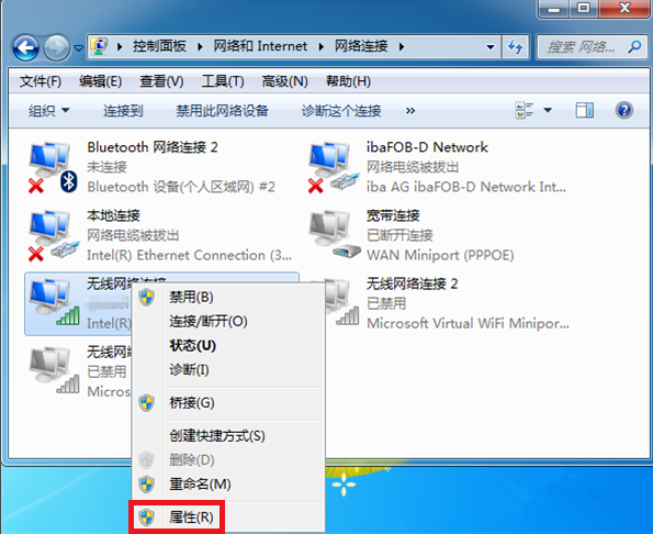 進入頁面,用鼠標右擊【無線網(wǎng)絡(luò)連接】,在出現(xiàn)的選項中點擊【屬性】。