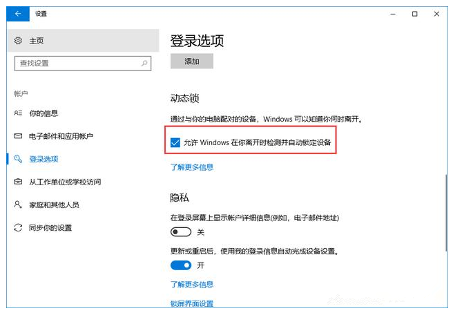 配對成功后,使用快捷鍵【Win】+【X】進入到設置界面-【賬戶】-【登陸選項】,找到動態鎖,勾選允許Windows在你離開時檢測并自動鎖定設備。