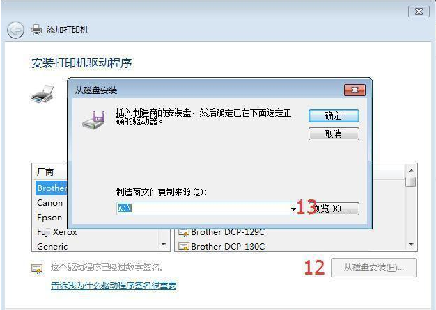 點擊從磁盤安裝,跳出從磁盤安裝的窗口,點擊瀏覽找到下載好的打印驅動打開,下一步。