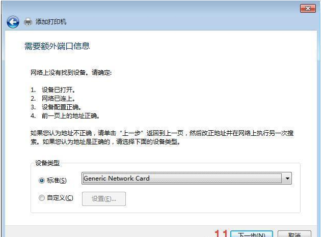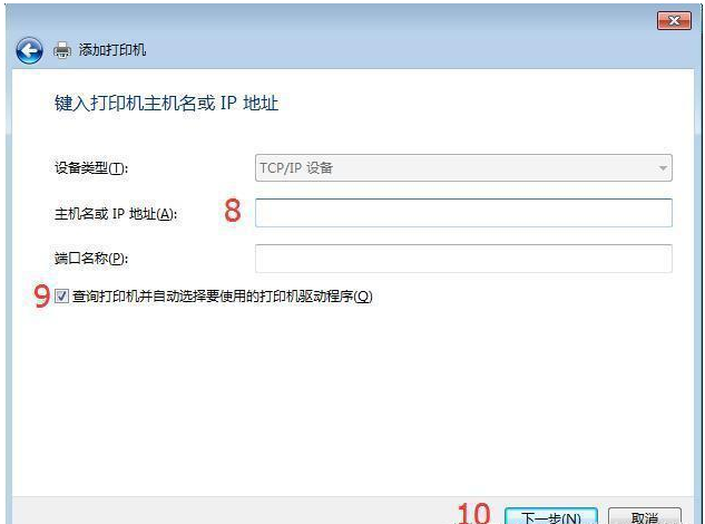 填寫打印機IP地址進去,同時去掉查詢打印機前面的√,點擊下一步,再下一步。