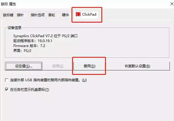 第二步:在“鼠標(biāo)屬性”窗口中,我們選擇“clickpad”選項(xiàng)卡,這個(gè)就是觸摸板的功能,我們點(diǎn)擊“禁用”,最后點(diǎn)擊“確定”。如圖: