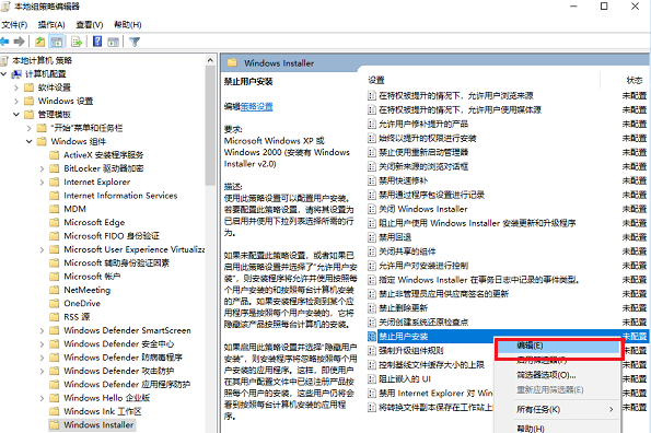 在Windows Install右側找到“禁止用戶安裝”,右鍵編輯,如下圖所示: