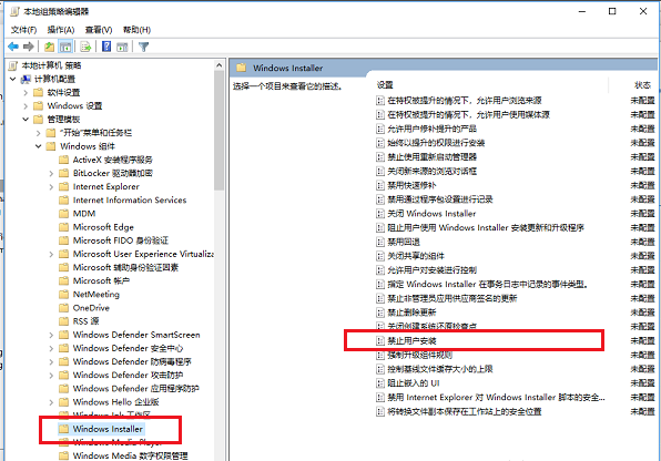 依次點擊“管理模板->Windows組件->Windows Install”,如下圖所示: