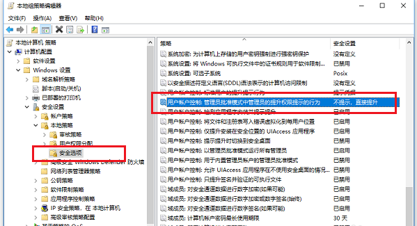 進去之后,依次點擊“計算機配置->Windows設置->安全設置->本地策略->安全選項”,在右側找到用戶帳戶控制:管理審批模式下管理員的提升提示行為選項,雙擊進去,如下圖所示: