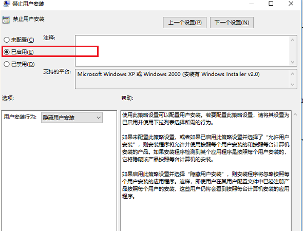 進去之后,將禁止用戶安裝進行啟用就完成了,如下圖所示: