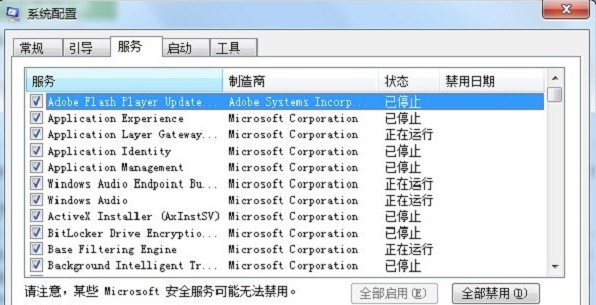 3、點擊“服務”,關閉一些后臺服務項目,如下圖所示: