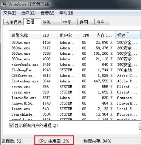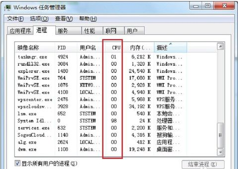 點擊確定后,我們就可以看到各個程序的CPU使用情況了,如下圖所示: