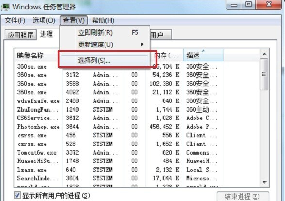 如果我們想看各個程序使用CPU的情況,點擊“查看”,選擇“選擇列”,如下圖所示: