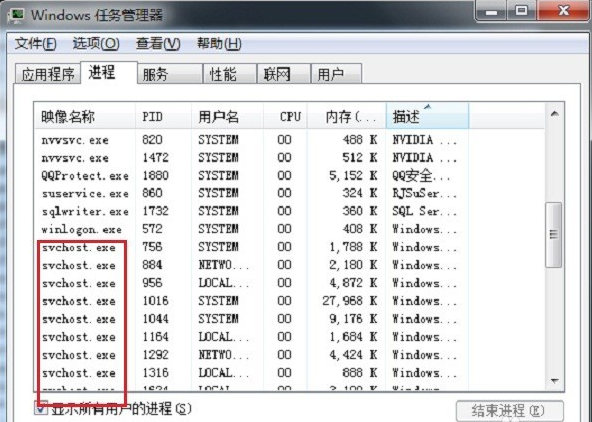 打開任務管理器,結束掉使用CPU高的應用程序,但是有一些進程不能結束掉,可能會造成計算機重啟,如svchost.exe等,如下圖所示: