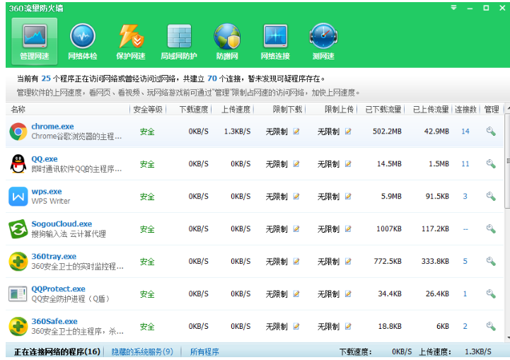 3、打開流量防火墻之后,可以看到正在連接網絡的程序的流量使用情況,可以監控應用程序已下載流量和已上傳流量,如下圖所示: