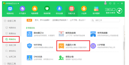 2、進去功能大全界面之后,點擊網絡優化,選擇流量防火墻,如下圖所示: