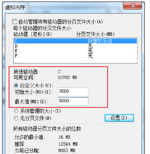 5、取消自動管理所有驅(qū)動器的分頁文件大小的勾選,選擇自定義大小,將c盤虛擬內(nèi)存最小值設(shè)為3000,最大值設(shè)為5000,點(diǎn)擊確定就設(shè)置完成了,如下,