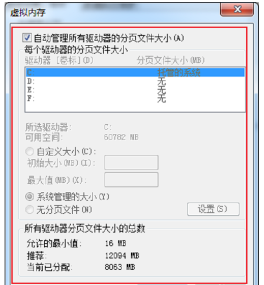 4、進(jìn)去虛擬內(nèi)存界面之后,可以看到默認(rèn)是勾選自動管理所有驅(qū)動器的分頁文件大小,如下圖所示:
