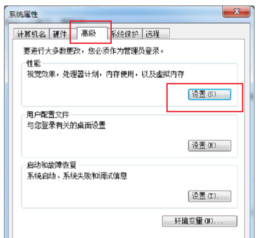 2、進(jìn)去系統(tǒng)屬性高級界面之后,選擇性能中的“設(shè)置”,如下圖所示: