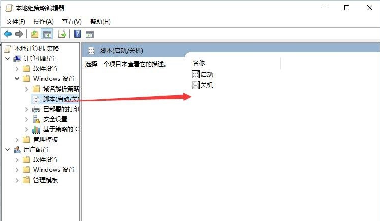在打開的本地組策略編輯器窗口,依次展開:計算機配置 - Windows設置 - 腳本(啟動/關機),左鍵雙擊窗口右側的關機;