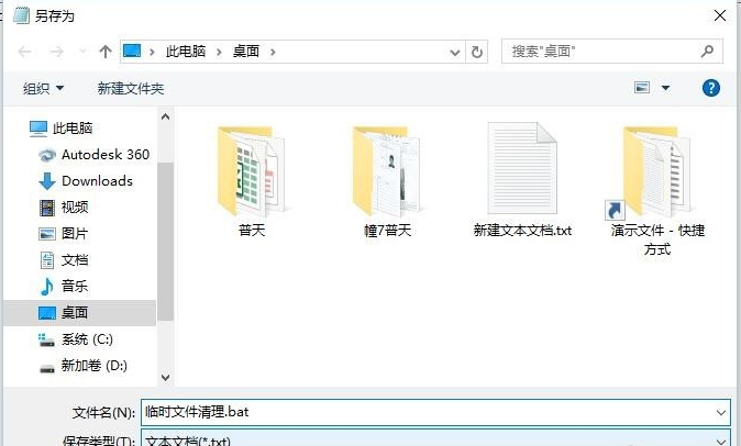 在打開的另存為窗口中點擊:桌面,在文件名(N)欄輸入:臨時文件清理.bat,再點擊保存。