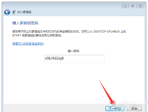 此時“加入家庭組”界面將顯示“鍵入家庭組密碼”窗口,在此輸入Win10系統(tǒng)“家庭組密碼”,點(diǎn)擊“下一步”按鈕。