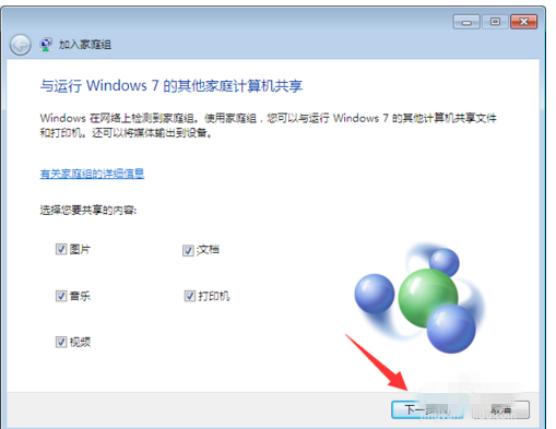 接著從打開的“創(chuàng)建家庭組”界面中,按照向?qū)нM(jìn)行操作,選擇要共享的文件內(nèi)容,點(diǎn)擊“下一步”按鈕。