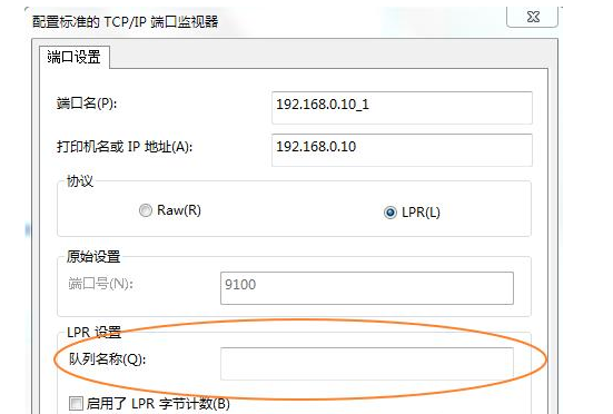 6、如果為單口打印服務器(第6步省略),在隊列名稱中輸入該打印機連接打印服務器的端口名稱,端口名稱進打印服務器的WEB頁面可以查詢到