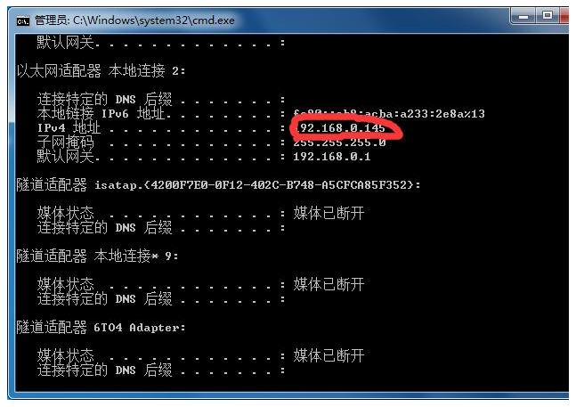 先查看一下自己電腦的IP地址,使用ipconfig命令查看。