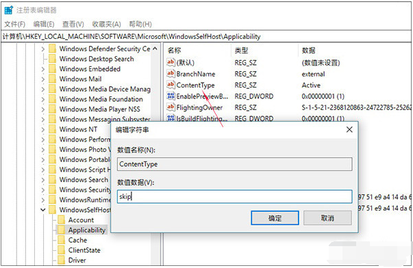 3. 點擊Cortana搜索框,輸入“regedit”進入注冊表編輯器。依次展開至“計算機/HKEY_LOCAL_MACHINE/SOFTWARE/Microsoft/WindowsSelfHost/Applicability”,雙擊右側“ContentType”,將默認的鍵值由“Active”修改為“skip”,點擊確定,同樣保持注冊表編輯器不動;