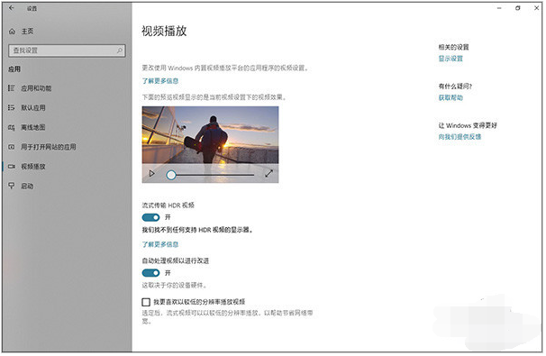 播放的視頻太亮太暗怎么辦?很簡單,點擊Win10“設置”→“應用”→“視頻播放”,打開“自動處理視頻以進行改進”就可以了。這項功能依賴于某些特定硬件(如顯卡、顯示器),只要你的硬件支持,開啟開關后,Win10就會自動對目標視頻啟用HDR特效,能夠明顯提升暗部區域的細節質感。