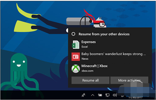 一臺電腦上執行的程序,更換一臺電腦就能瞬間轉移過來?這聽上去似乎有些科幻電影的味道,但我們的確已經可以在現實生活中體驗到了。在Win10中,小娜就充當了這樣一個能將多個設備連接在一起的角色。通俗點兒說,小娜會將你當前打開的網頁、正在使用的文檔自動上傳云端。當你啟動另一臺電腦,并登錄同一微軟賬戶時,便會下載并詢問你是否切換到上次未完成的工作里。很顯然,這項功能對于職場精英是具有超強吸引力的。而且它不用你做任何操作,直接享受就可以了。