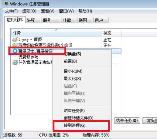 2、在任務(wù)管理器界面選擇應(yīng)用程序,找到需要結(jié)束任務(wù)的應(yīng)用,選中右鍵,選擇轉(zhuǎn)到進(jìn)程,
