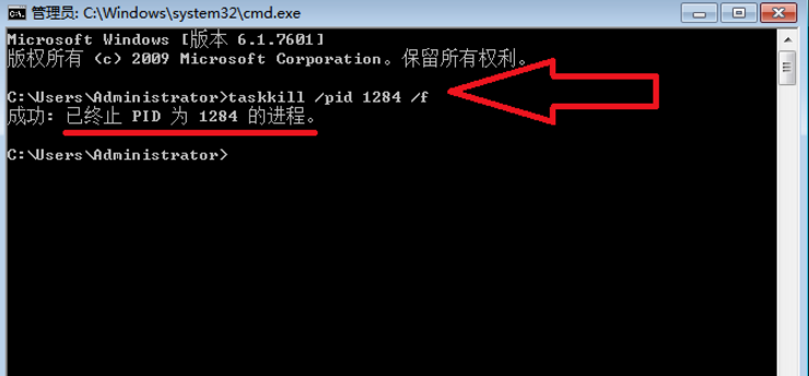 在程序里輸入taskkill /pid 1284 /f,回車就會(huì)結(jié)束相應(yīng)任務(wù)。注意:輸入字母的時(shí)候一定要有空格!!!!
