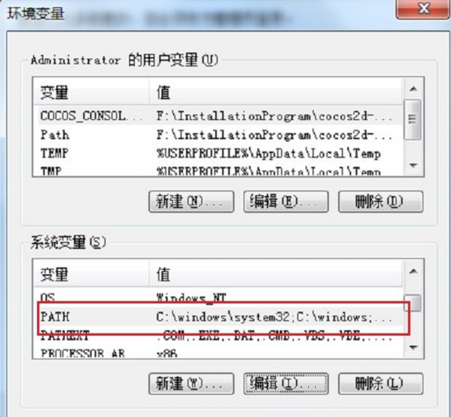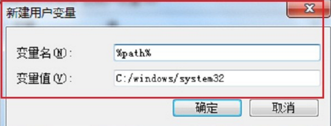 4、在用戶變量點擊新建,用戶名"%path%”,變量值“C:/windows/system32”,如下圖所示: